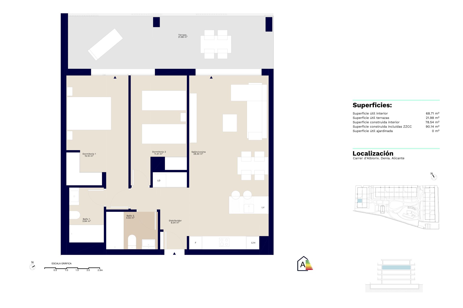 Apartment with 2 spacious bedrooms and a large living room with an open-plan kitchen, 2 bathrooms, located in an exclusive residential complex in Dénia, just 200 m from the beach.
