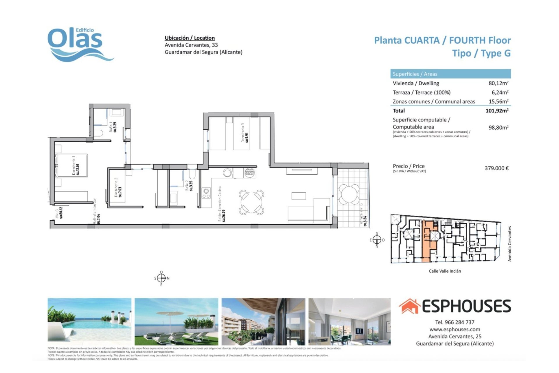 Nowoczesny apartament położony zaledwie 100 metrów od piaszczystej plaży Playa Centre, w samym centrum Guardamar del Segura. Znajduje się na ostatnim (4.) piętrze prestiżowego kompleksu Olas i oferuje prywatność, dużo światła oraz boczny widok na morze.